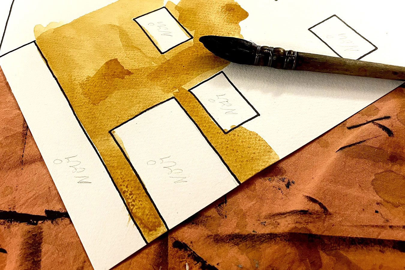 Dans chaque peinture sur papier, Christelle Richard-Dauphinot ménage un rectangle en blanc de réserve qui incarne la lumière émanant de la maison. Ce rectangle tranche d’autant sur les noir et ocre jaune du bâti. Pour renforcer l’effet sériel, toutes ces demeures s’inscrivent dans un format portrait en progression mathématique. L’ensemble occupe la totalité du plus grand mur d’exposition du Salon Reçoit.