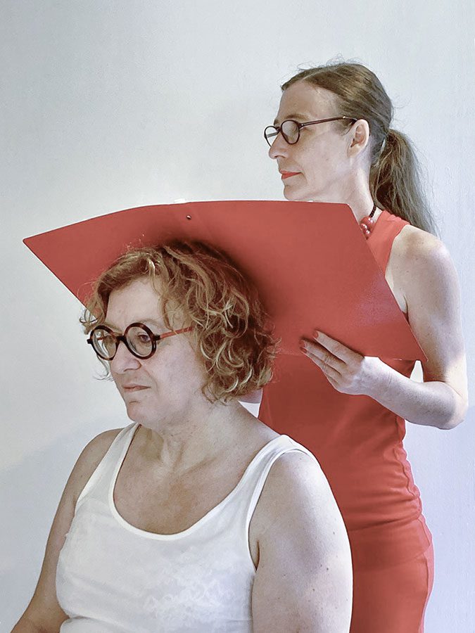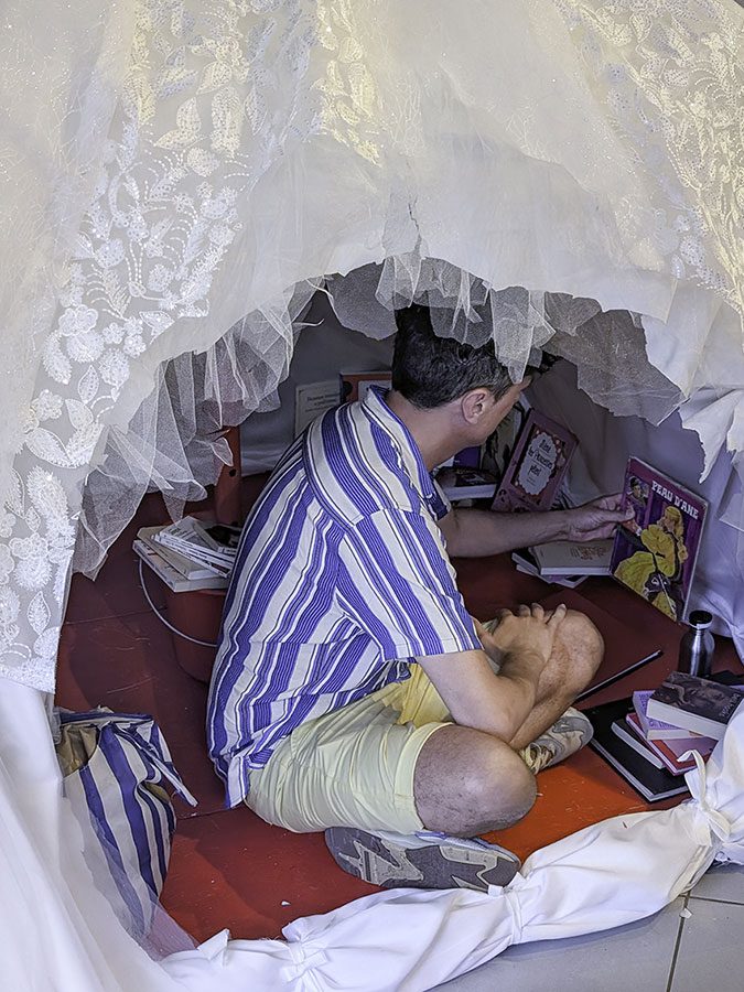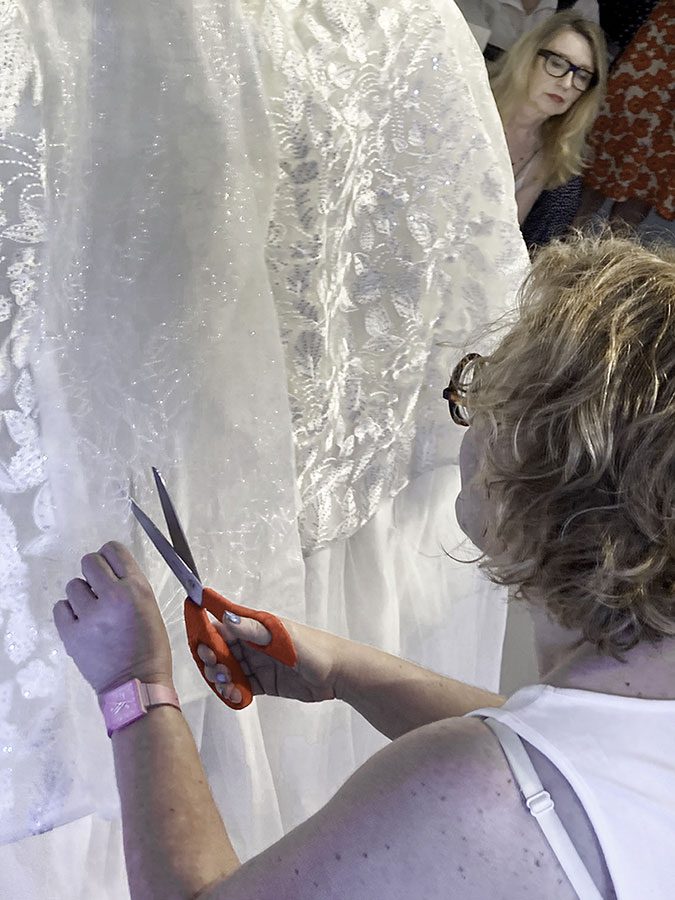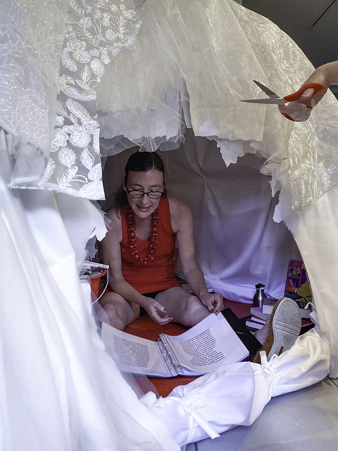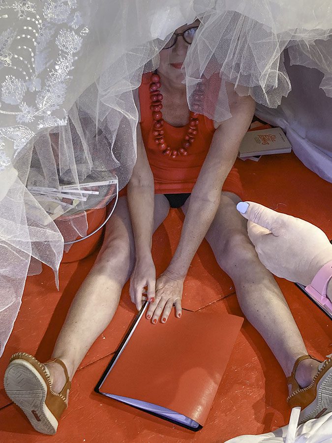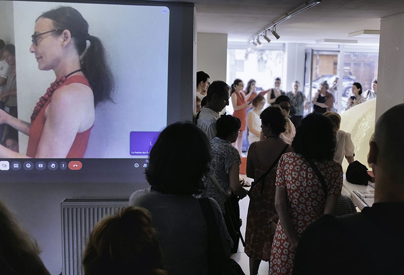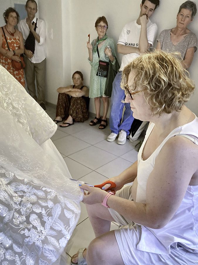 La performance du vendredi 13 juin 2025 à La Palette des Possibles est une action incisive : l’artiste cisèle, dévoile voire déflore le sens profond de l’œuvre. Elle se fait accompagner par deux complices : l’actrice de théâtre Céline Pérot lit un florilège de textes choisi par l’artiste ; La plasticienne Marie Tessier cisèle le débardeur de l’artiste.