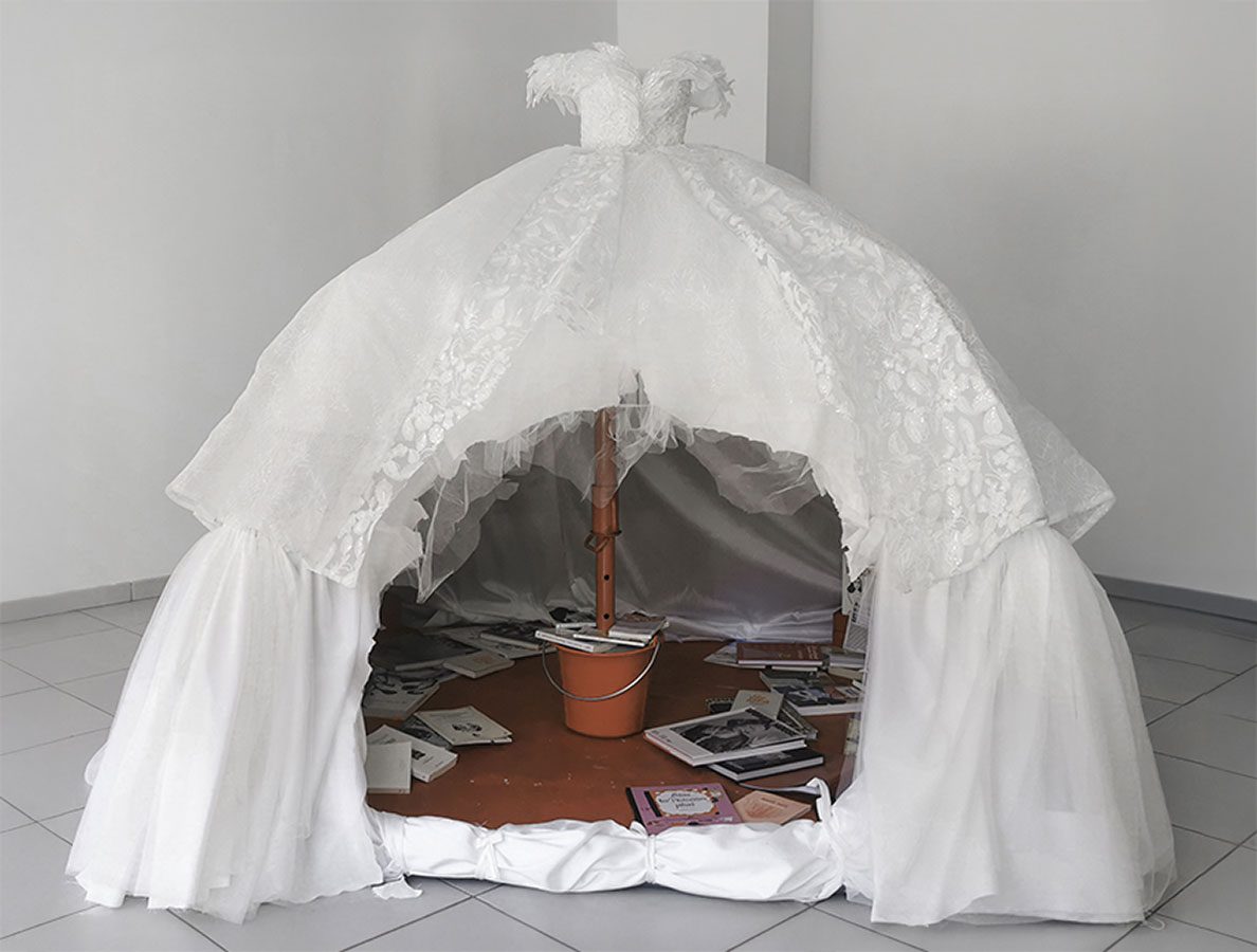 La question des femmes, y’a de quoi dire. Ça déchire ! C’est du béton ! L’artiste a chiné une robe de mariée. Oui, mais alors ?
