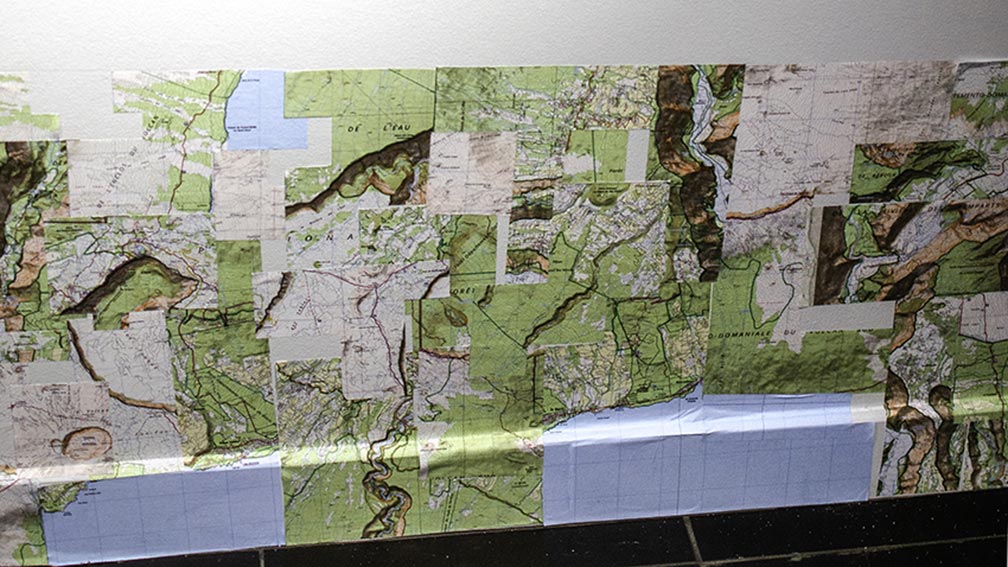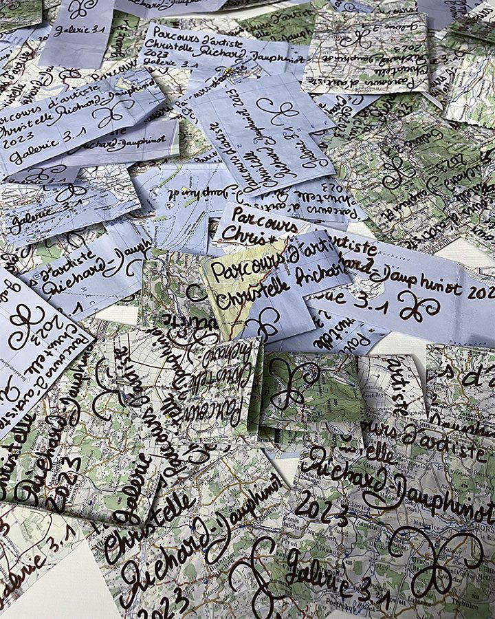 « La Wandererin se joue des frontières temporelles et terrestres ». A l’occasion de cette exposition, elle découpe des fragments de ses cartes de voyage pour composer un ensemble collé à même le mur de la galerie.